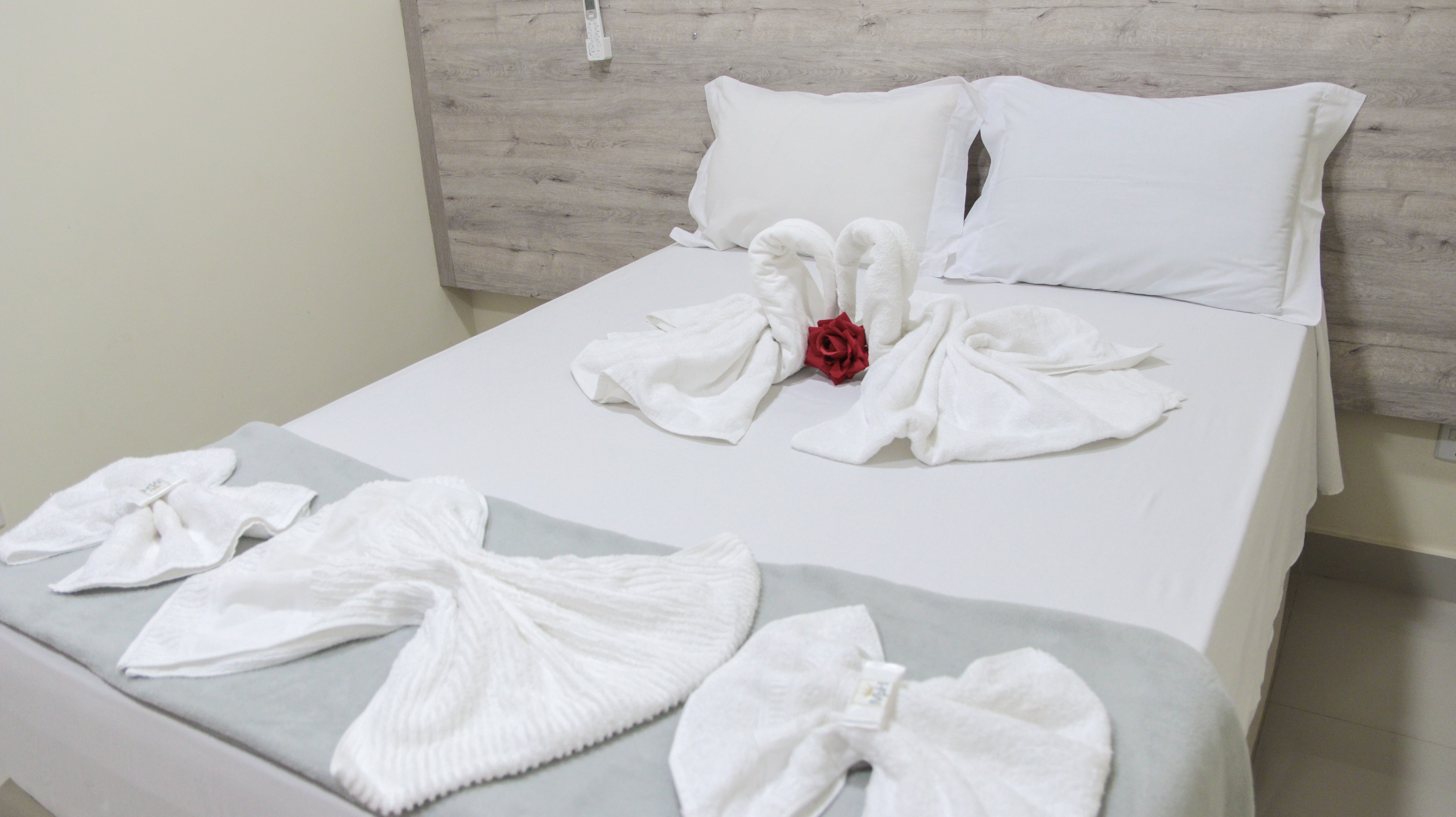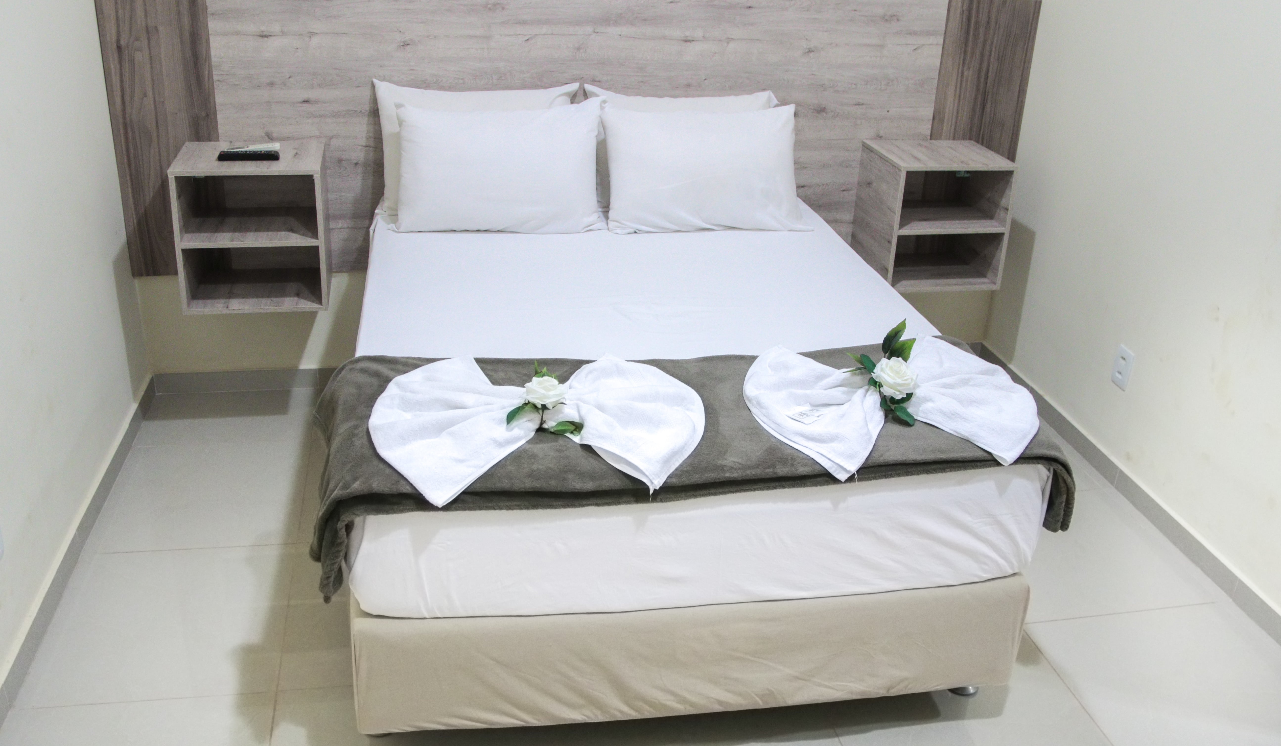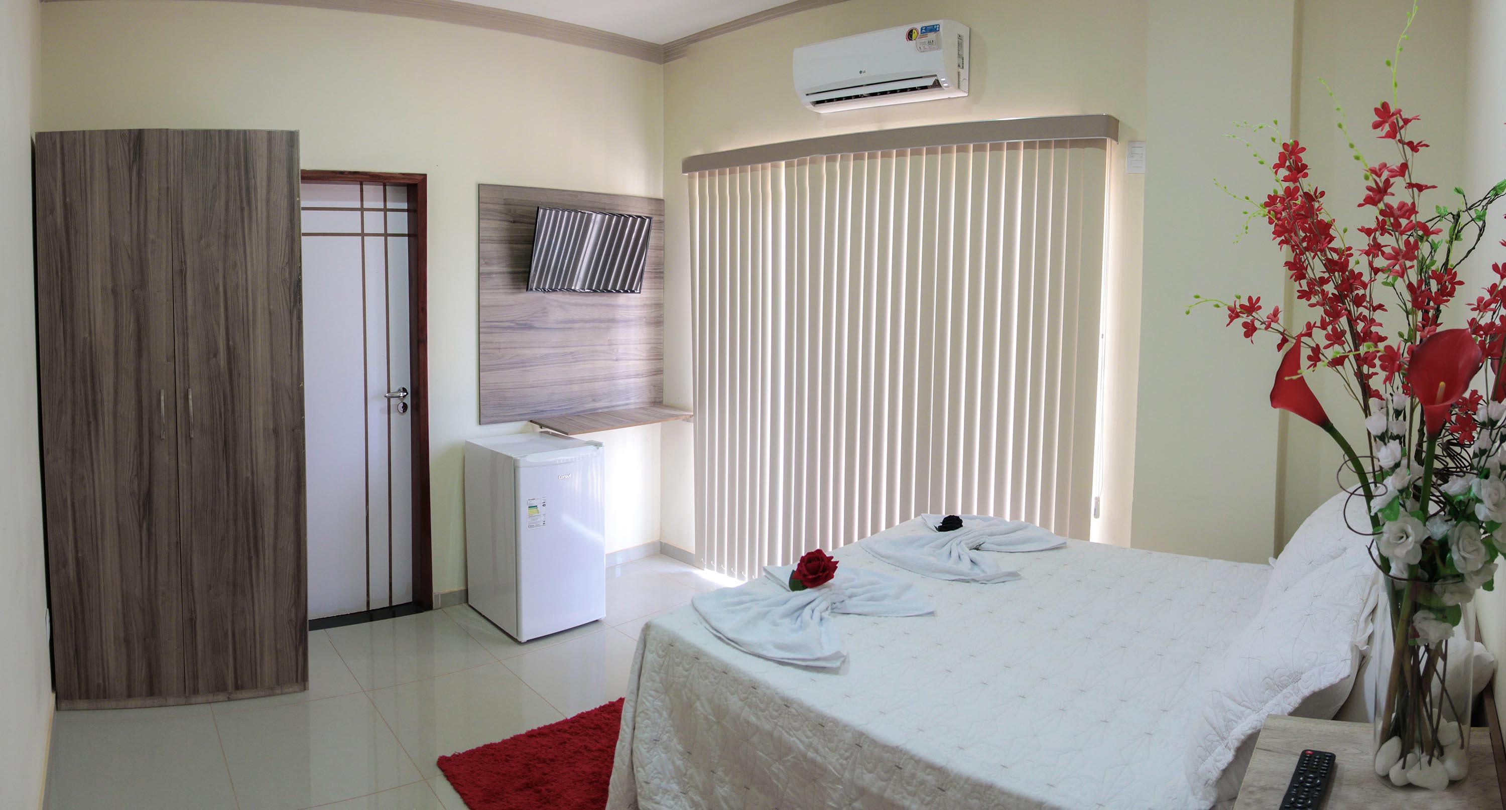 Suíte para você e seu(a) cônjuge, com todo o conforto que você merece. TV, frigobar, ar-condicionado e a mais bela vista da cidade. Conta com uma cama de casal.