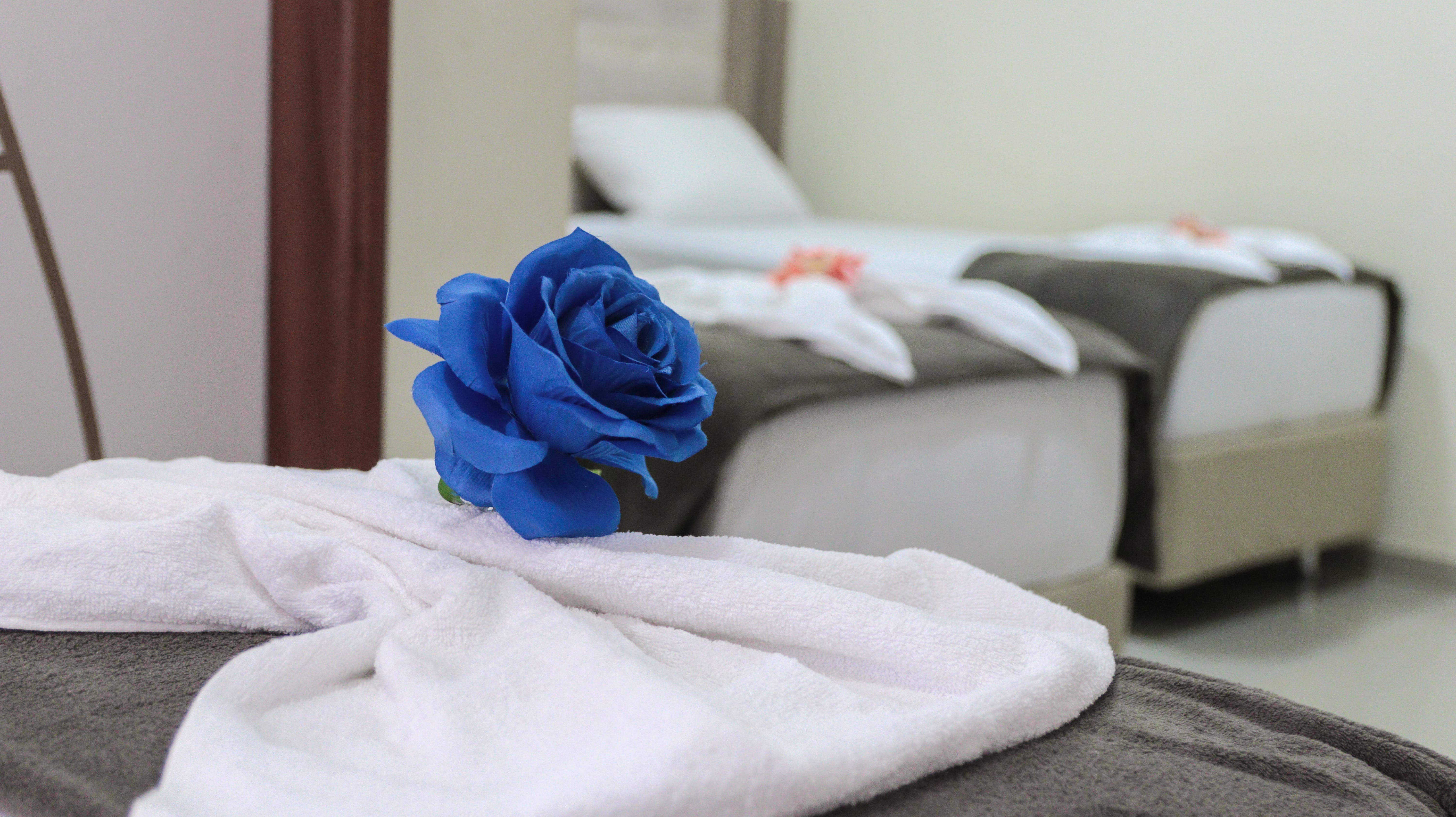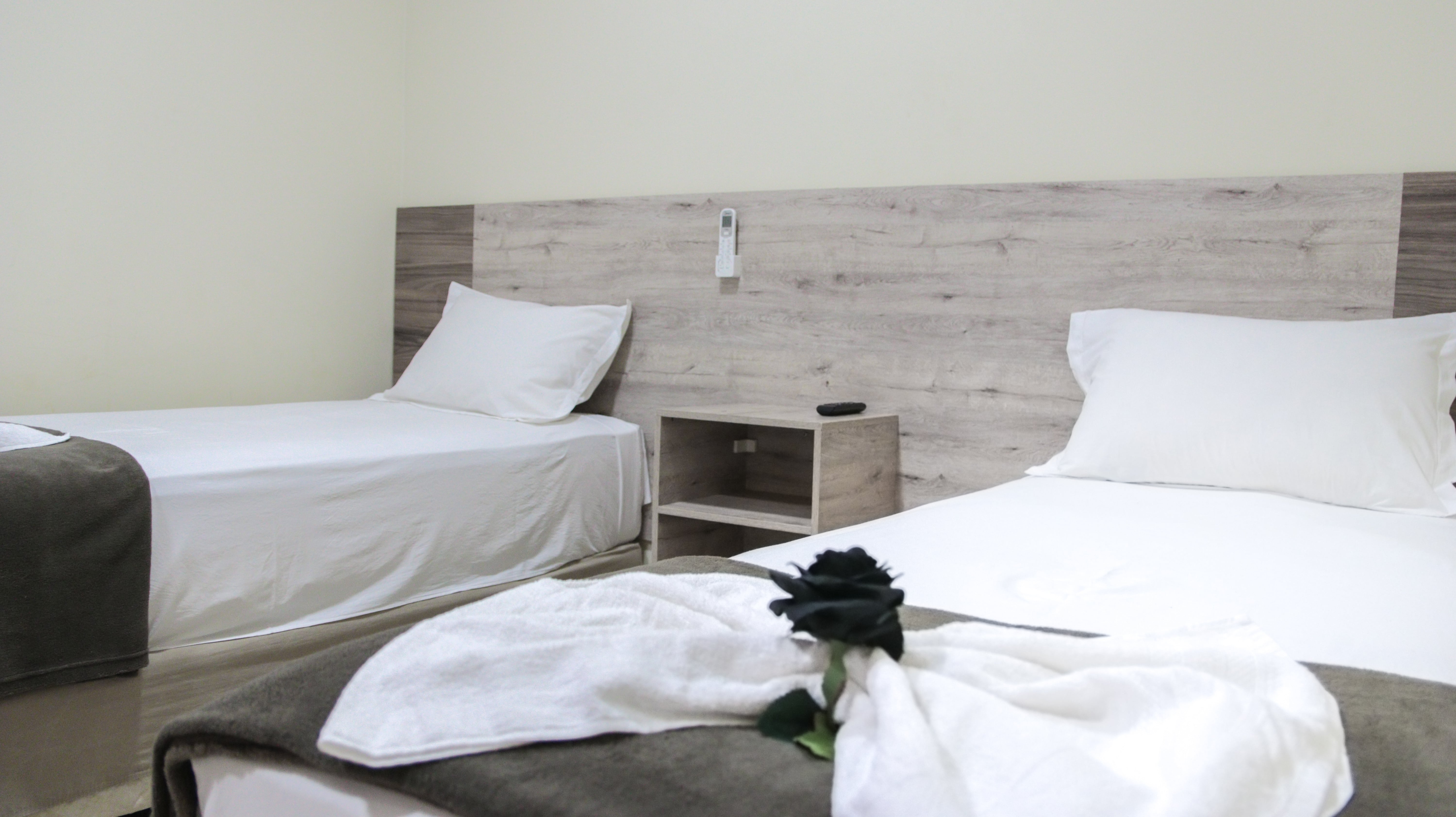 Suíte para você, seu(a) cônjuge e seu filho, com todo o conforto que você merece. TV, frigobar, ar-condicionado e a mais bela vista da cidade. Conta com uma cama de casal e uma cama de solteiro.