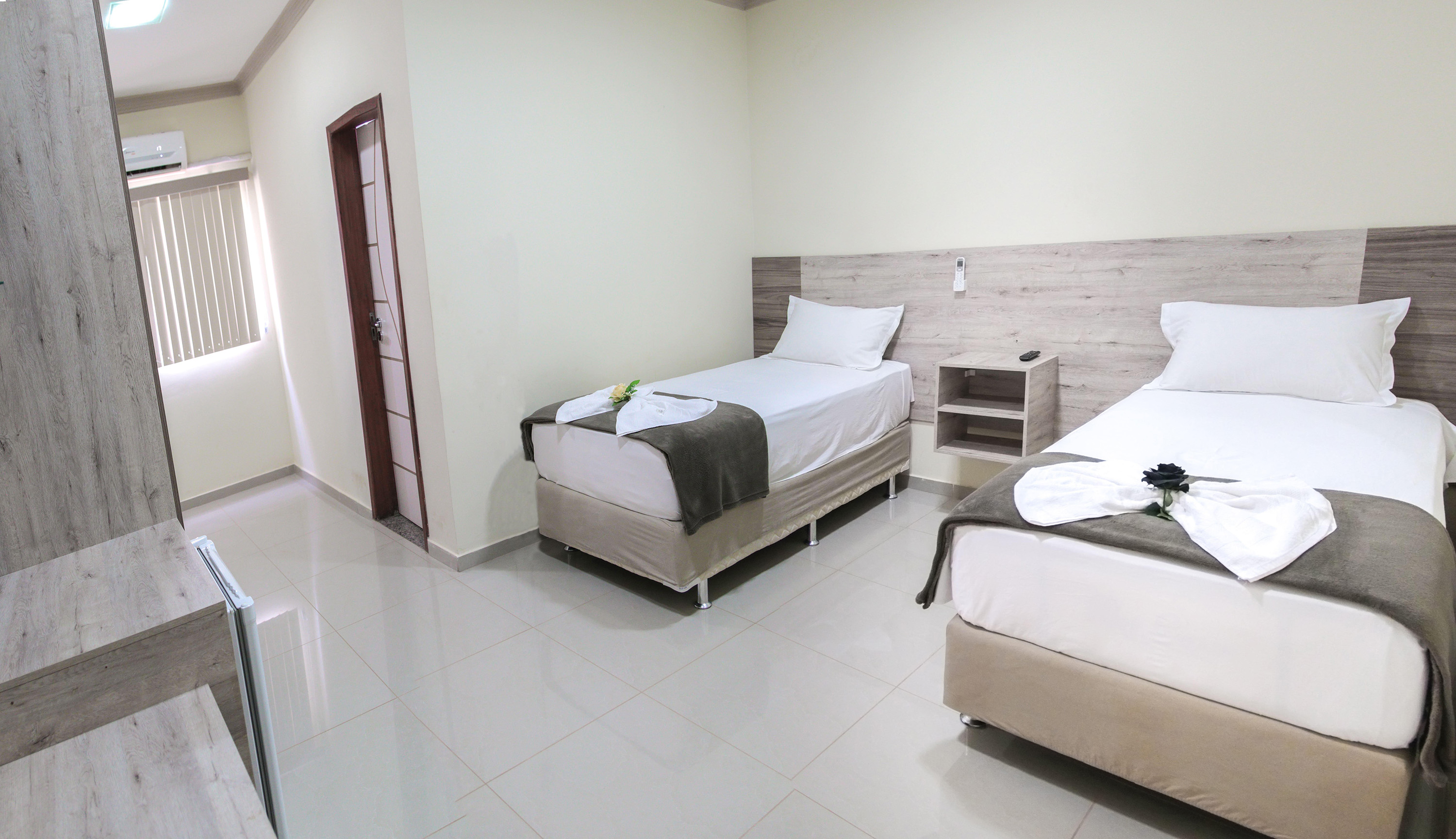 Suíte de grande charme, com todo o conforto que você merece. TV, frigobar, ar-condicionado e a mais bela vista da cidade. Conta com três camas de solteiro.